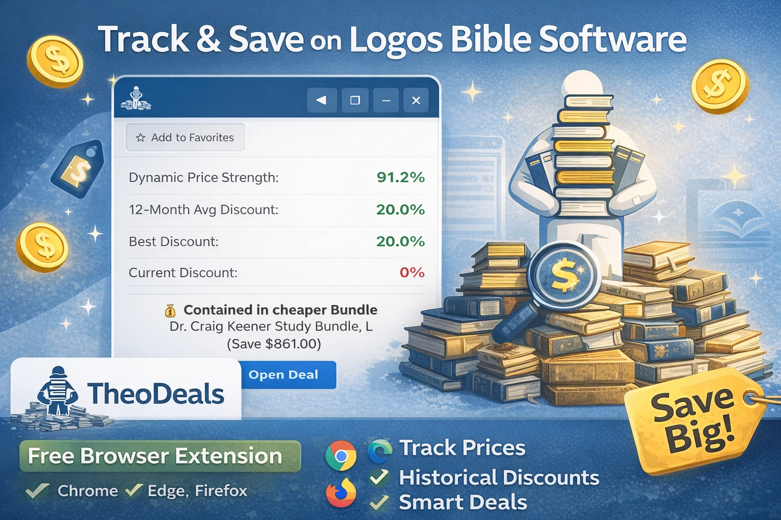 Die kostenlose Browser-Erweiterung mit Preisverlauf und Rabattmustern für Logos Bibelsoftware.